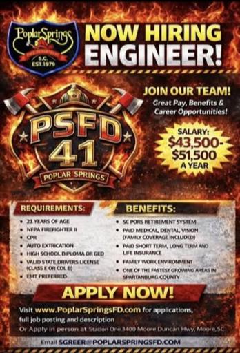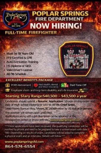 We are hiring! Please see the Job Postings tab for job descriptions and application download. Applications can be dropped off in person at 3400 Moore Duncan Hwy, Moore, SC. Emailed applications can be sent to sgreer@poplarspringsfd.com Attn: Chief Greer.